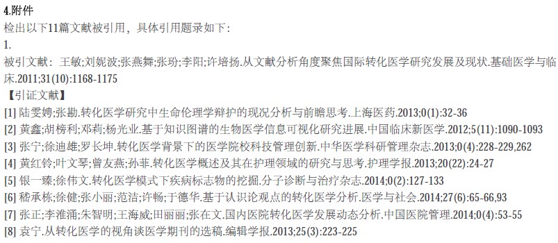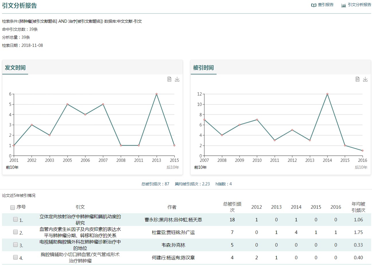 Tips:引文分析报告由检索结果集发文和被引时间分布、引证综合指标统计及论文近5年被引情况统计三部分组成。 h指数:是基于“论文历年被引情况”表中“总被引频次”降序排序的文献列表。其含义为检索结果集中有N篇文章至少被引用了N次,N即为h指数。此度量标准减少了为高度引用或尚未被引用论文分配的不当权重。h指数值的计算仅包括CBM数据库中的项目,不包括未收录期刊中的论文和图书专著等。 论文近5年被引情况:按照引文近5年总被引频次大小降序排列。表中的“年均引用频次”表示引文自发表后的年均被引频次(计算公式为=总被引频次/已发表的年代数)。选择记录前面的复选框时,可以只保存标记记录的引文分析结果。 Tips:查引报告包括查引检索条件、被引概览、被引明细及附件4部分组成,由点击“引文报告”页面右上角的“查引报告”按钮即可一键式生成。其中,他引频次表示去除单篇论文全部作者以外其他人发表文献引用次数之和。