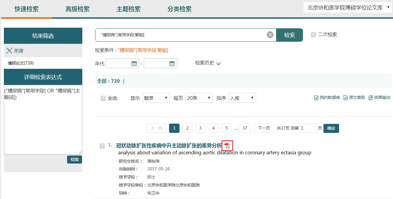 (2)北京协和医学院博硕学位论文全文:如果贵单位订购了此类资源,用户在检索结果页面点击标题右侧的