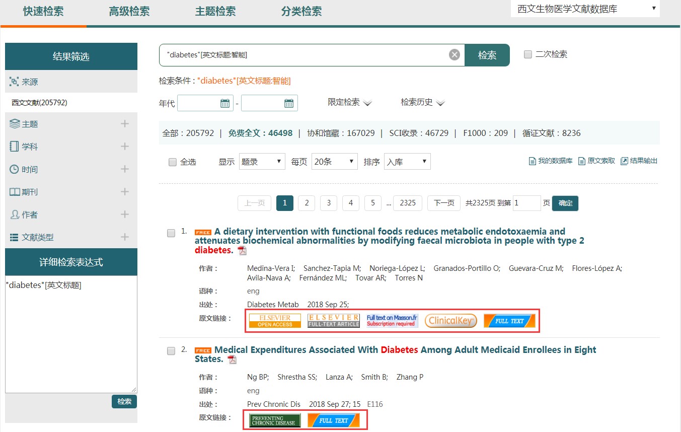 (3)西文生物医学期刊文献全文:为帮助用户方便快捷地查找、利用互联网免费西文期刊文献,SinoMed对网络生物医学免费期刊及其文献进行了全面系统的整理。进入WBM检索结果页面,点击“免费全文”分类导卡,用户可以快速、准确地查找免费期刊文献线索并获取全文。